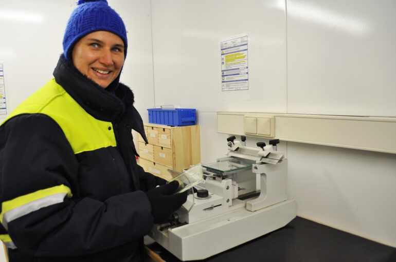 Grundlage für die Berechnungen am Computer ist die Auswertung der Aufnahmen von den Schliffen. Da ist handwerkliches Können gefragt „Am besten gefällt mir die Handarbeit mit dem filigranen Material der Schliffe“, so Kerch. „Das ist beinahe meditativ, wenn man sich an die Kälte gewöhnt hat“. Zwei Stunden Arbeit am Stück sind im Eislabor erlaubt. Kaffee trinken hilft gegen die frostigen Temperaturen und ein gutes Frühstück ist die wichtigste Voraussetzung. „Mit leerem Magen hält man es nicht lange in der Kälte aus“, schildert sie ihre Erfahrungen.