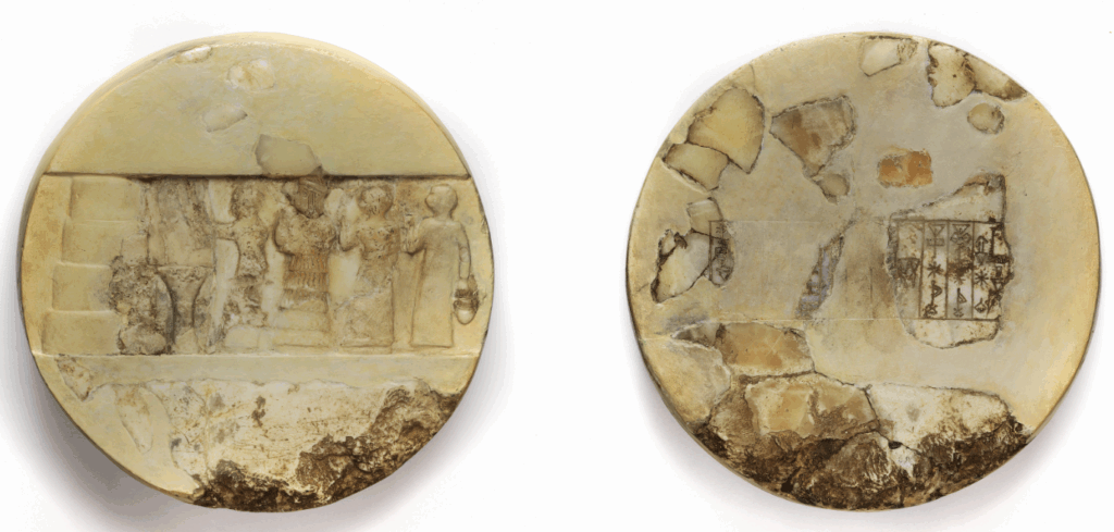 Alabasterscheibe mit Abbildung und Inschrift, die aus der Zeit um ca. 2300 v. Chr. stammt. Die Priesterin En-hedu-ana, deren Name sich in Keilschrift auf der Rückseite der Scheibe findet, ist, wie die Forschungen von A. Zgoll zeigen, die früheste namentlich bekannte Autorin der Welt (vgl. Zgoll A. 2024, En-ḫedu-ana: The birth of literature through the goddess, Iraq 86, 153-179. (Open Access https://doi.org/10.1017/irq.2024.22). Die Scheibe, deren Fundort die altmesopotamische Stadt Ur ist, hat eine Breite von rund 25 Zentimetern.