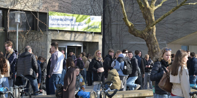 Im Foyer des ZHGs schieben sich die Massen. Die Besucher*innen sehen etwas jünger aus als die üblichen Studierenden und sie haben viele Fragen im Gepäck: Zu den Infotagen der Universität Göttingen sind mehrere tausend Schüler*innen und andere jungen Menschen angereist, die sich für ein Studium in Göttingen interessieren. In mehr als 150 Veranstaltungen wie Vorträgen und Campusführungen, einem Science Slam und an rund 80 Informationsständen erhalten sie Einblicke in das breite Studienangebot und das Unileben. Auch für Lehrkräfte ist gesorgt: Sie können sich im Infocafé bei Kaffee, Saft und Keksen darüber austauschen, wie sie die Jugendlichen und jungen Erwachsenen in ihrer Studienentscheidung unterstützen können.